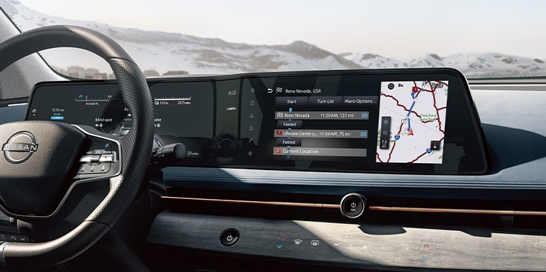 ARIYA offers two advanced driver assistance systems: ProPILOT Assist 2.0 is the most advanced, or there’s ProPILOT Assist with Navi-link. Both can lend a hand during stop-and-go traffic to assist you during your commute. [*] Consumer activation of NissanConnect Services ProPILOT Assist 2.0 package ("Package") required for ProPILOT Assist 2.0 functionality. Package trial period included with new vehicle purchase. Trial period may be subject to change or termination at any time and without notice. After trial period ends, monthly subscription fee required. See www.nissanusa.com/connect/legal for more subscription information. ProPILOT Assist 2.0 cannot prevent collisions. It is the driver’s responsibility to be in control of the vehicle and monitor traffic conditions at all times. Hands-off freeway driving is possible when driving in a single lane, on the condition that the driver remains attentive on the road ahead and is prepared to immediately take manual control of the steering wheel when conditions of the road, traffic, and vehicle require it. System operates only when lane markings are detected. Does not function in all weather, traffic and road conditions. System has limited control capability and the driver may need to steer, brake or accelerate at any time to maintain safety. See Owner’s Manual for safety information. [*] ProPILOT Assist, ProPILOT Assist 1.1, and ProPILOT Assist with Navi-link cannot prevent collisions. It is the driver’s responsibility to be in control of the vehicle at all times. Always monitor traffic conditions and keep both hands on the steering wheel. System operates only when lane markings are detected. Does not function in all weather, traffic and road conditions. System has limited control capability and the driver may need to steer, brake or accelerate at any time to maintain safety. See Owner’s Manual for safety information.